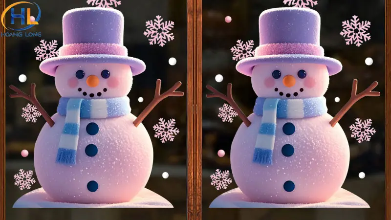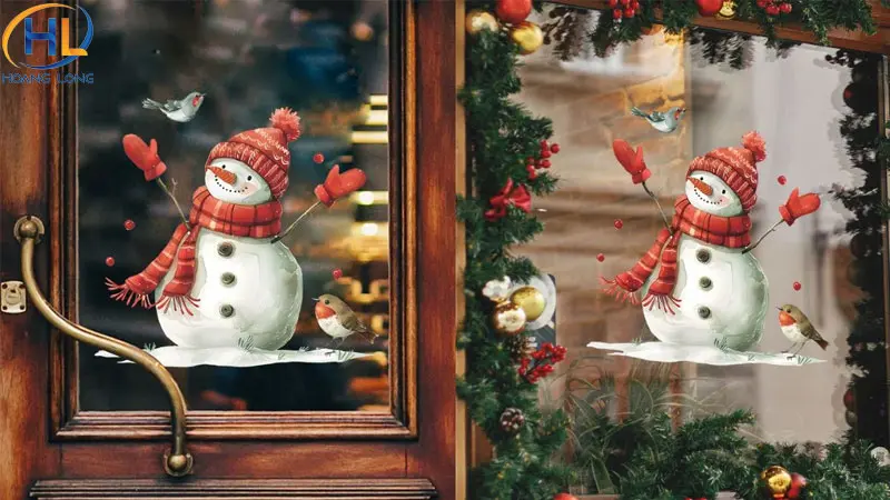 Hình ảnh người tuyết đội mũ Noel luôn tạo cảm giác dễ thương và gần gũi. Bạn có thể dán decal hoặc hình xốp người tuyết lên cửa kính, kết hợp thêm bông tuyết nhỏ xung quanh để tạo không khí mùa đông. Đây là ý tưởng rất phù hợp với gia đình có trẻ nhỏ, lớp học hoặc cửa hàng cần sự thân thiện.